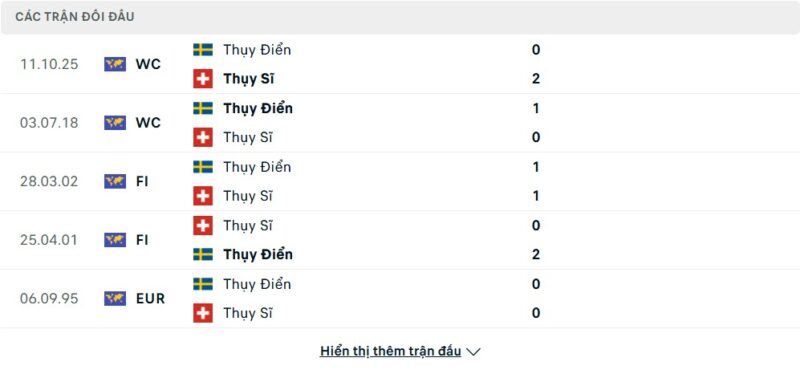 Thành tích đối đầu của Thụy Sĩ vs Thụy Điển