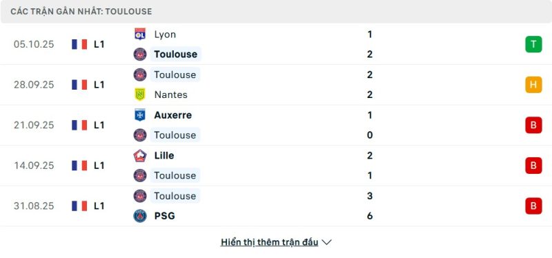 5 trận gần nhất của Toulouse: W-D-L-L-L