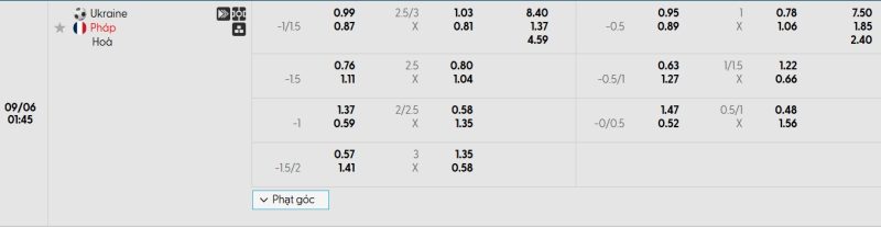 Bảng Tỷ lệ kèo bóng đá Ukraina vs Pháp