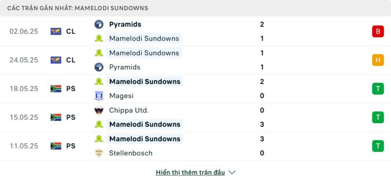 5 trận gần nhất của Mamelodi Sundowns: L-D-W-W-W