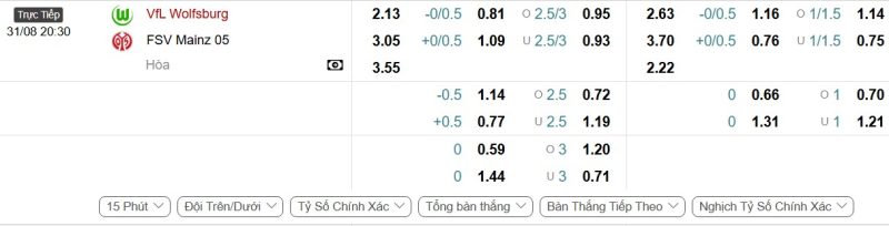 - Kèo tỷ số bóng đá hiệp 1: VfL Wolfsburg 2-0 Mainz 05