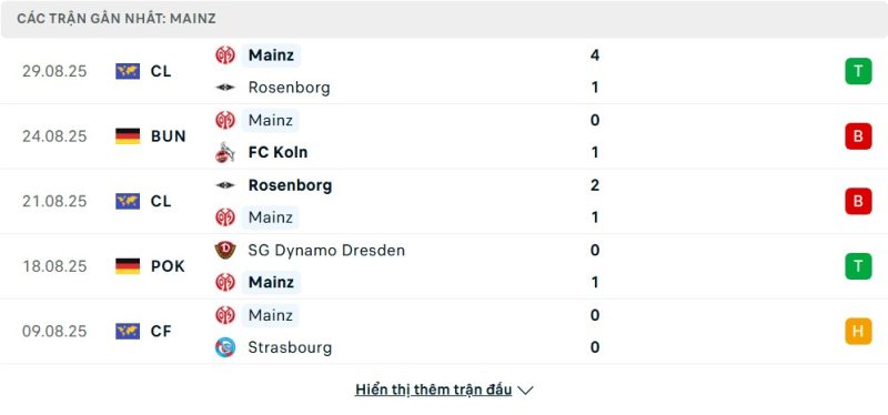 5 trận gần nhất của Mainz 05: W-L-L-W-D