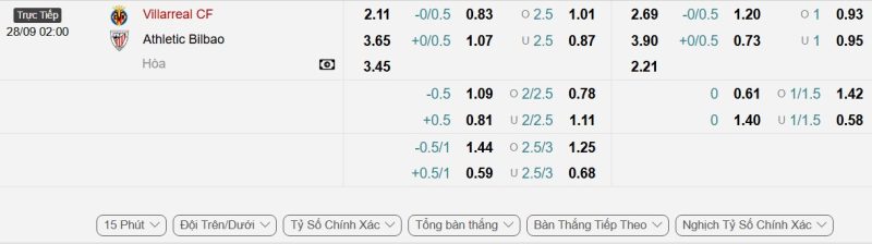 Bảng Tỷ lệ kèo bóng đá Villarreal vs Athletic Bilbao