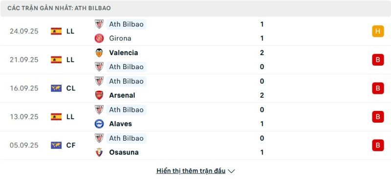 5 trận gần nhất của Athletic Bilbao: D-L-L-L-L