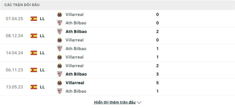 Thành tích đối đầu của Villarreal vs Athletic Bilbao