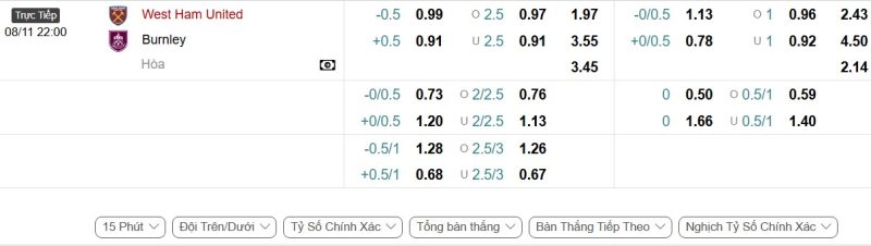 - Kèo tỷ số bóng đá hiệp 1: West Ham United 2-0 Burnley