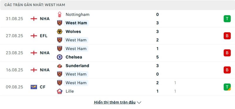 West Ham United đang có một khởi đầu mùa giải đầy khó khăn và biến động. Sau 3 vòng đấu, “The Hammers” mới chỉ có được 3 điểm và đang tạm thời đứng ở vị trí thứ 16 trên bảng xếp hạng. Họ đã phải nhận những thất bại nặng nề trước Sunderland 0-3 và đặc biệt là trận thua 1-5 ngay trên sân nhà trước Chelsea. Tuy nhiên, điểm sáng hiếm hoi là chiến thắng ấn tượng 3-0 trên sân của Nottingham Forest ở vòng đấu gần nhất. Kết quả này phần nào cho thấy West Ham vẫn sở hữu sức tấn công đáng gờm và có thể gây bất ngờ khi có được sự tự tin.