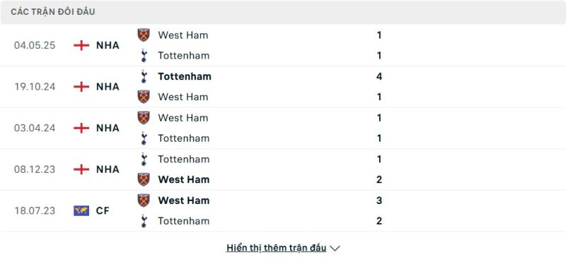 Thành tích đối đầu của West Ham United vs Tottenham Hotspur